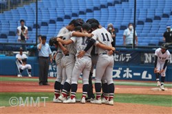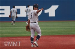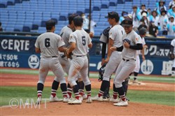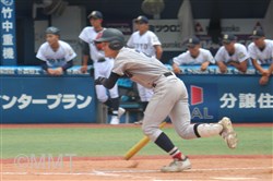 9番 峯 中飛 1番 緒方 一直 2番 上田 左前安打 3番 椎木 四球 4番 小泉 二ゴロ 9回の攻撃は2アウトから2番上田、3番椎木がヒットと四球でチャンスを作る。ただ好機を活かせず無得点で終わる。 ◇ 9回表 6番 中飛 7番 右前安打 8番 右前安打 9番 一邪飛 1番 投飛 この回の守りは先頭バッターをセンターフライに打ち取る。 続く7番、8番バッターにヒットを打たれピンチを迎える。しかし、最後はピッチャーフライに抑え、準決勝に駒を進めた。 |