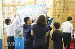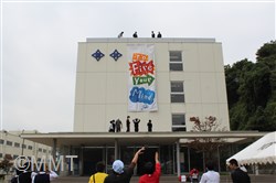 横校祭準備期間はとうとう最終日となり、ました。室内の装飾は仕上げに入り、お客さんを迎える準備が整いました。校舎の外では、垂れ幕の装飾を垂らす作業があり、その下では父母の会の屋台の準備が進み、文化祭の雰囲気が仕上がってきました。