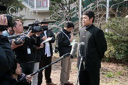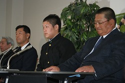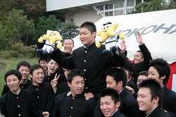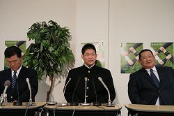 2009年10月29日プロ野球の高校生ドラフトが行われた。横浜高校ではドラフト会議に先立ち、記者会見場にはたくさんの報道陣が詰め掛けた。 ドラフト会議開始前、筒香選手、渡辺監督が姿を見せた。その後、小倉部長、平野学校長が順に姿を見せた。 ドラフト会議が始まると緊張な面持ちでラジオに耳を傾けた。そして横浜ベイスターズから単独1巡目指名を受けて、筒香選手は満面の笑みを浮かべた。そして、質疑応答が行われた。 会見終了後、筒香選手はグランドに出て共に頑張ってきた野球部三年生から祝福を受け胴上げをされた。その後横浜ベイスターズのマスコット「ホッシー」のぬいぐるみを持ち喜びをあらわにした。 その後横浜ベイスターズ関係者が来校し対談を行った。 |