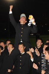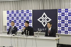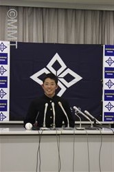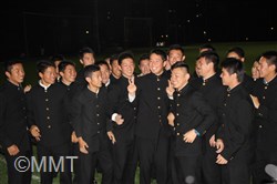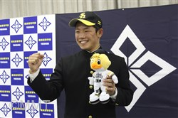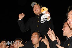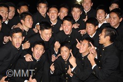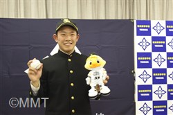 2017年10月26日(木)プロ野球新人選択会議(ドラフト会議)が行われました。横浜高校からは、 増田 珠 選手がプロ志望届を提出していました。 18時25分頃、別室でドラフト会議の中継を見ていた増田選手がソフトバンクから3巡目に指名されました。その後、会見会場の会議室に移動し、高校3年生の野球部の仲間が見守る中、記者会見が始まりました。 まず、葛校長が「本校から今年もプロ野球選手を排出することができてうれしく思います。学校として増田くんの今後の活躍に期待しています。」と話しました。 増田選手は、指名された瞬間の気持ちを、「指名されるまでドキドキしていましたが、指名していただいて頭の中が真っ白になりました。」と話し、「夢であったプロ野球選手へのスタートラインに立ててうれしく思います。野球少年に夢を与えられるような選手になりたいと思います。」と挨拶をしました。 ソフトバンクの印象を「強く、ファンが温かいイメージ」と語り、「長崎出身なので、はやく一軍に行って、九州の皆さんにプレーしているところを見てもらいたいです。」と話しました。 どんな選手になりたいかという質問に対して、「元気と声が持ち味なので、松田選手のような熱い選手になりたいです。」と力強く語り、対戦したい投手に、横浜高校の先輩の藤平投手をあげ、「『ソフトバンクに決まりました』とはやく電話をしたいです。」と話しました。 また、「息の長い選手になりたいと思っているので、40歳まで現役でいられる選手になりたいです。」と話し、そして、「声と元気でチームを引っ張れる選手となって、笑顔を絶やさず頑張っていきたいです。」と力強く語りました。 写真撮影に応じた後、野球部の仲間が待つ第一グラウンドに移動し、胴上げで祝福されました。そして、校歌を肩を組んで歌い、喜びを分かち合いました。 |
