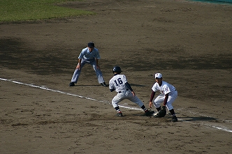 | 6回表: | 3番下水流が内野安打で出塁すると、続く福田はデットボールでランナー1、2塁のチャンス。しかし、岡田がダブルプレーに倒れ、ランナー3塁となり、越前が三振に倒れて、またもやチャンスを逃す。 |