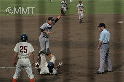 2回表 松元はセカンドゴロに倒れるが、小田はレフト線への二塁打で出塁。続く中原のところでワイルドピッチがあり小田は三塁へ。中原はセンター前に運び1点追加する。中岡は送りバントを決め二死二塁とし、前の打席でタイムリーを打っている大石が打席へ。しかし、ここはショートゴロに倒れた。