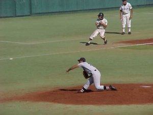 ピッチャー山木がレフト前ヒットを打たれ、福井と交代する。エラーがらみで無死1・3塁となり、それをスクイズにより1点先制される。その後も、 レフト前ヒットで1死3塁で、またもやスクイズを決められ、結局この回で2点を失う。