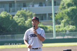 その後、平田監督が「20名を決めることは我々スタッフにとって苦しいことですが、チームで勝つために、心を鬼にして決めています。ユニフォームを着せてもらった選手には責任があります。また、スタンドで応援する部員皆の力が必要です。夏の大会に向けて一致団結していきたいと思います。」と話し、この夏のメンバー20名と記録員が紹介した。選手一人一人が力強く決意表明をし、板川投手は「チームを勝たせるピッチングをしたい」と話すと、及川投手は「板川さんに負けないピッチングをしたい」と力強く語った。